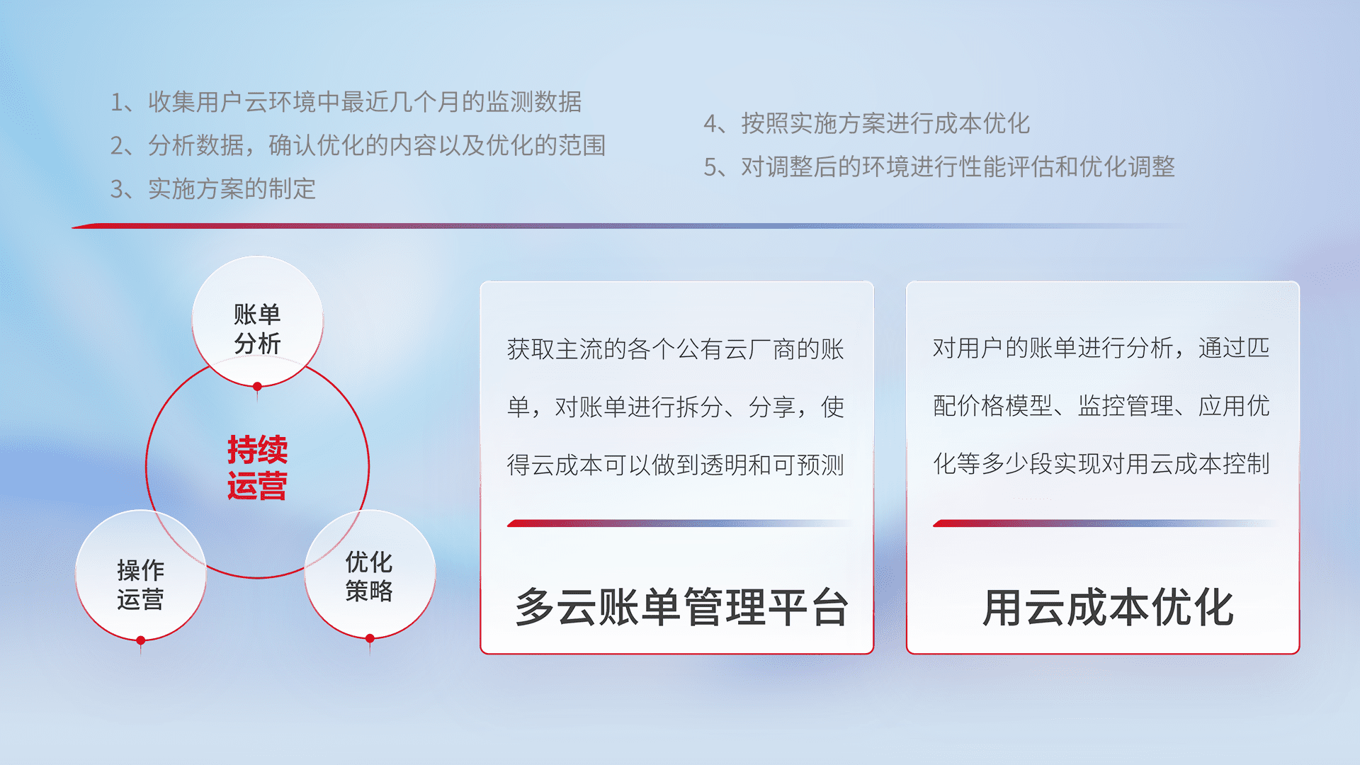 通过多云纳管,,以统一的资源数据模型把客户的云资源进行抽象和封装,,,,进而实现对多云资源的统一操作,,,保障云资源管理的可靠性、、、、稳定性与可用性。。量身定制化运维内容,,,配置、、、、开发运维、、补丁管理、、、备份、、、、监控、、认证和访问管理、、、、审计和日常巡检等,,,,保障在用云过程中的可靠度,,稳定度以及高可用率。。。。