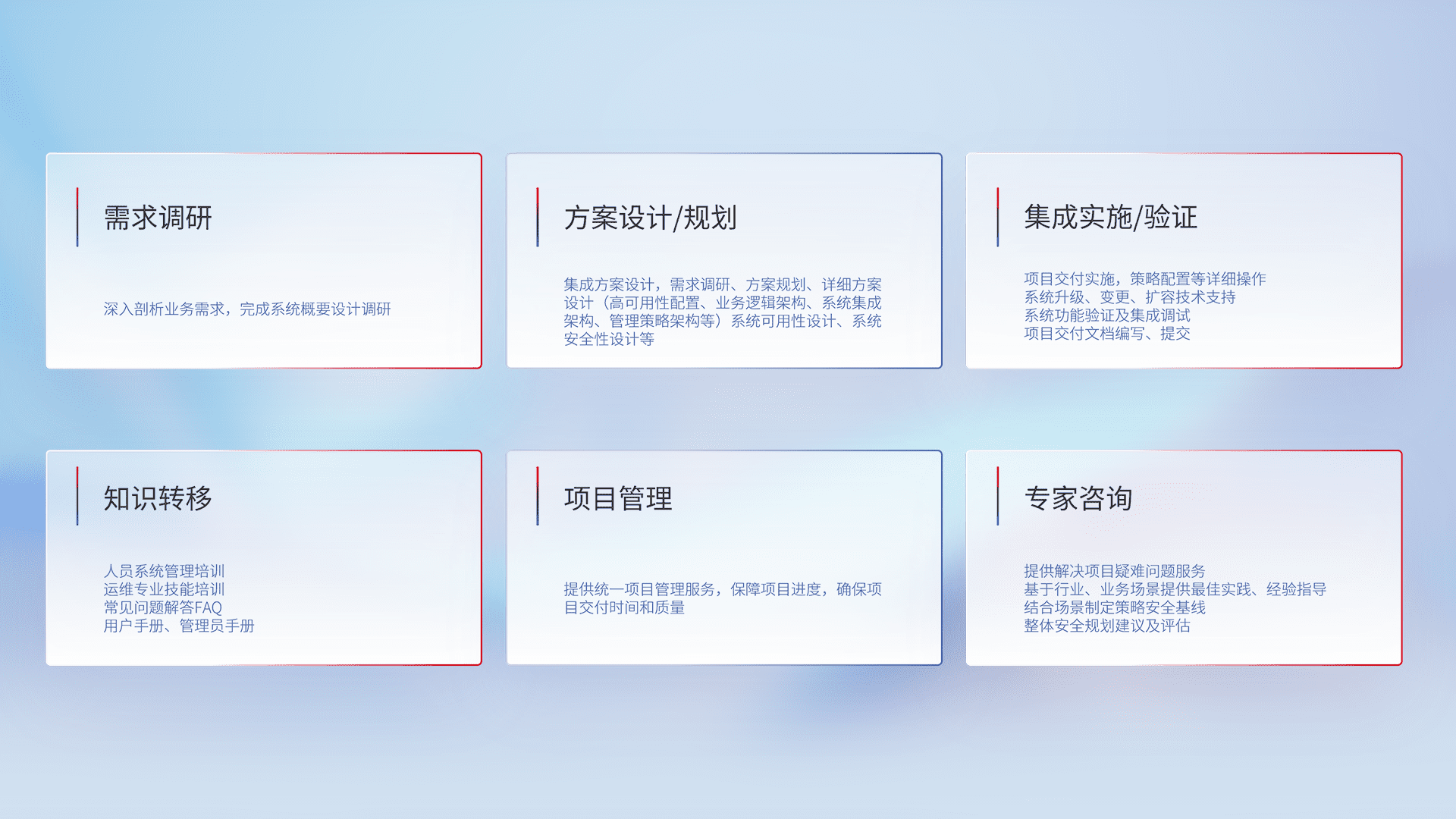 针对客户行业特性,,将宏观的安全战略和需求,,,通过专业的交付服务,,,,实现项目落地,,为客户提供标准规范的集成交付服务。。